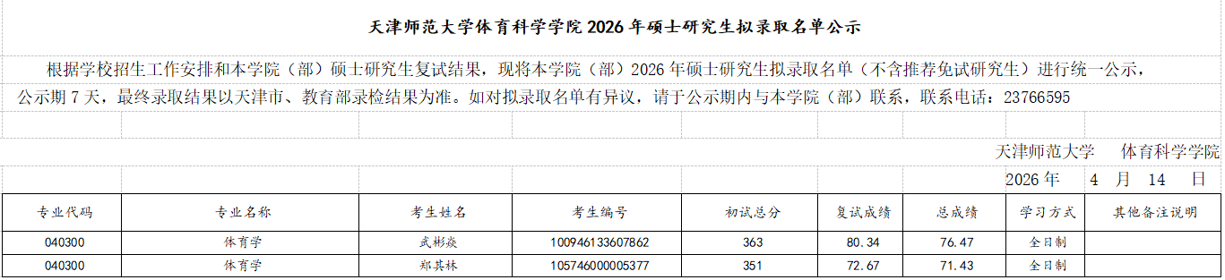 天津师范大学体育科学学院2026年硕士研究生拟录取名单公示